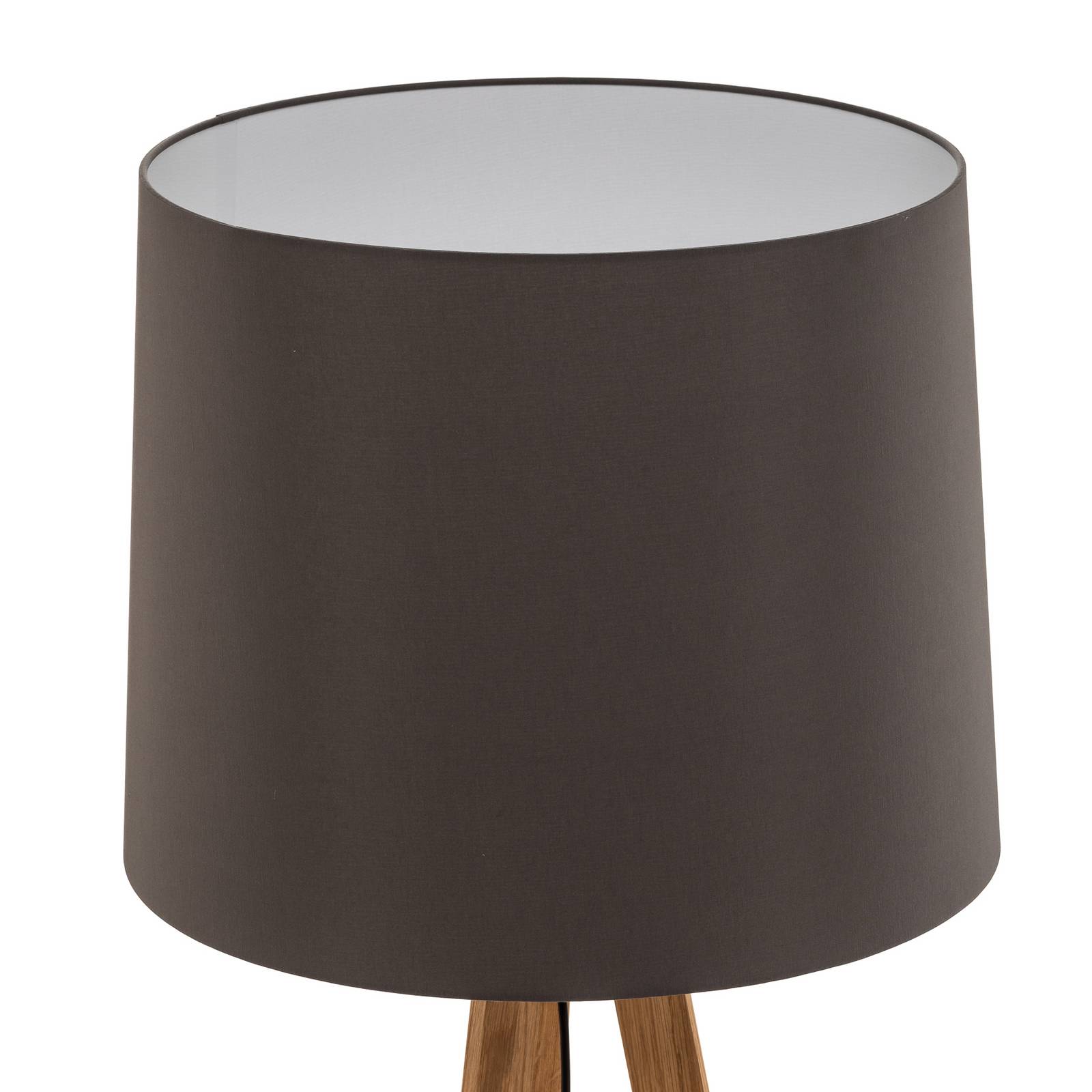 Lampada da terra Alos in rovere con paralume in chintz grigio grafite e struttura a treppiede, made in Germany Il paralume in tessuto grafite di alta qualità applicato a una pellicola di supporto ignifuga di qualità B1 si integra perfettamente con la struttura a treppiede in rovere. Il legno massiccio è stato sottoposto a una laccatura di alta qualità e la struttura del legno è ancora completamente riconoscibile, conferendogli un aspetto molto naturale. Tutti i componenti sono di altissima qualità e la lampada da terra, che può essere utilizzata in soggiorno o in camera da letto, è caratterizzata anche dal fatto di essere un prodotto di qualità che può vantare il marchio "made in Germany". L'interruttore si trova direttamente sotto il portalampada ed è quindi facilmente raggiungibile con un solo movimento, il che ne facilita l'utilizzo.