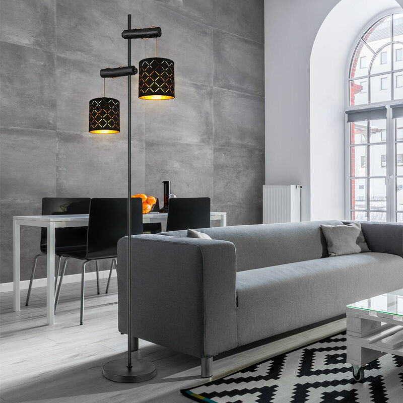 Descrizione Questa lampada da terra colpisce per il suo bel design in nero e oro. La lampada da terra è composta da 2 paralumi nero opaco con punzonature decorative, ognuna delle quali ha un attacco E27 ed è fissata ad un cavo color oro. Questi sono regolabili in altezza sull'asta in metallo nero opaco di 1,5 m di altezza. Con l'aiuto della presa E27, puoi utilizzare lampadine a tua scelta fino a una potenza massima di 40 watt. Puoi abbellire la tua zona giorno con altri modelli di questa serie. Le lampadine non sono incluse nella fornitura. Particolare lampada • Tipo di lampada: lampada da terra • Materiale: metallo, legno, tessuto • Colore: nero, oro • Interruttore • Grado di protezione: IP20 • Classe di protezione: 2 • regolabile in altezza • Diametro base lampada in cm: 23 • Diametro paralume in cm: 15 • Lunghezza x larghezza x altezza in cm: 41 x 23 x 150 • Prese: 2x E27 • Lampadina inclusa: n • Potenza della lampada: 2x massimo 40 watt • Alimentazione: 230V, 50Hz