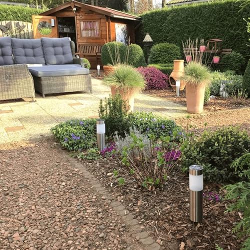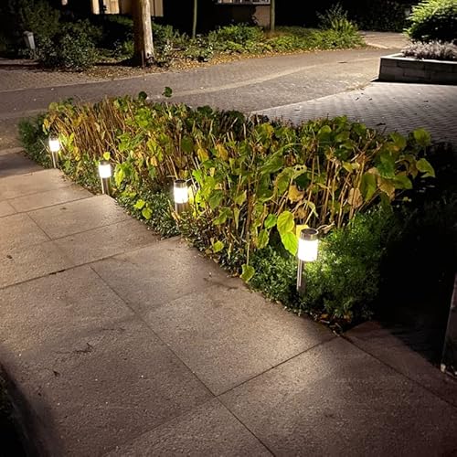 Lampada da terra a LED solare con picchetto, in acciaio inossidabile, a energia solare, luce bianca calda, picchetto da 18 cm, set di 4 pezzi.