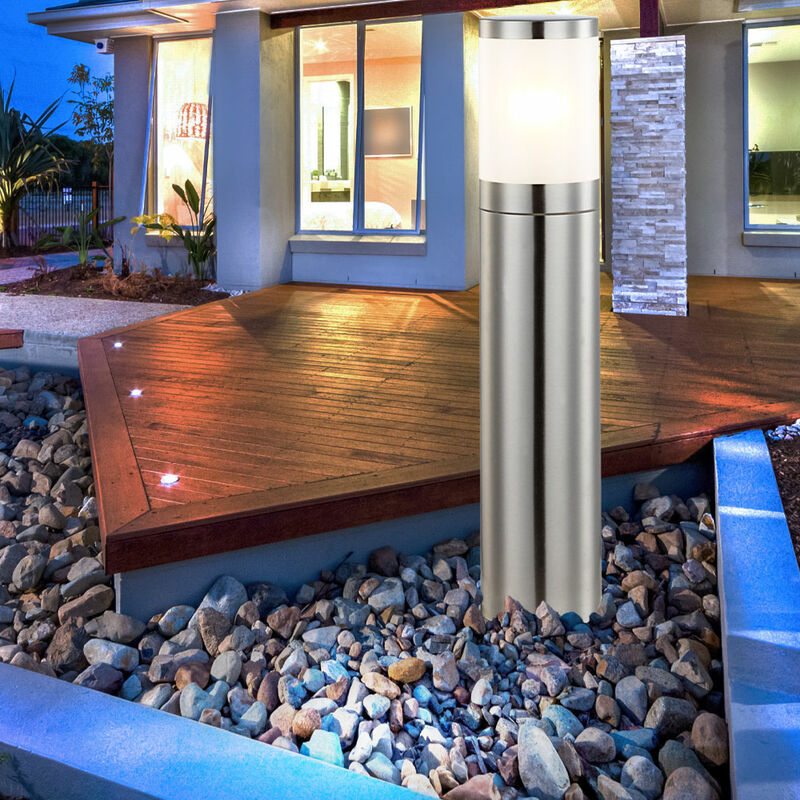 Descrizione Lampada da terra di design per uso esterno. Con molte di queste luci, ad esempio, il percorso attraverso il giardino può essere perfettamente messo in scena o alcuni oggetti nell'area outdoor della tua casa possono essere magnificamente accentuati. Grazie alla protezione IP44, questo apparecchio è protetto dagli spruzzi d'acqua ed è quindi predestinato all'uso esterno. Rispetto ai normali apparecchi di illuminazione, i faretti a LED consumano solo una quantità minima di elettricità e hanno un consumo persino inferiore rispetto alle lampade a risparmio energetico. Questo protegge l'ambiente e il tuo portafoglio. È inclusa una lampada LED da 10 watt di alta qualità a risparmio energetico! Dettagli • tipo di lampada: lampada da esterno • materiale: acciaio inossidabile • paralume: plastica opale, rigato • grado di protezione: IP44 • altezza: 50,0 cm • Diametro base: 14,0 cm • Diametro paralume: 10,2 cm • attacco: 1x E27 • lampada in Fornitura: Sì • Lampade LED: 10 watt