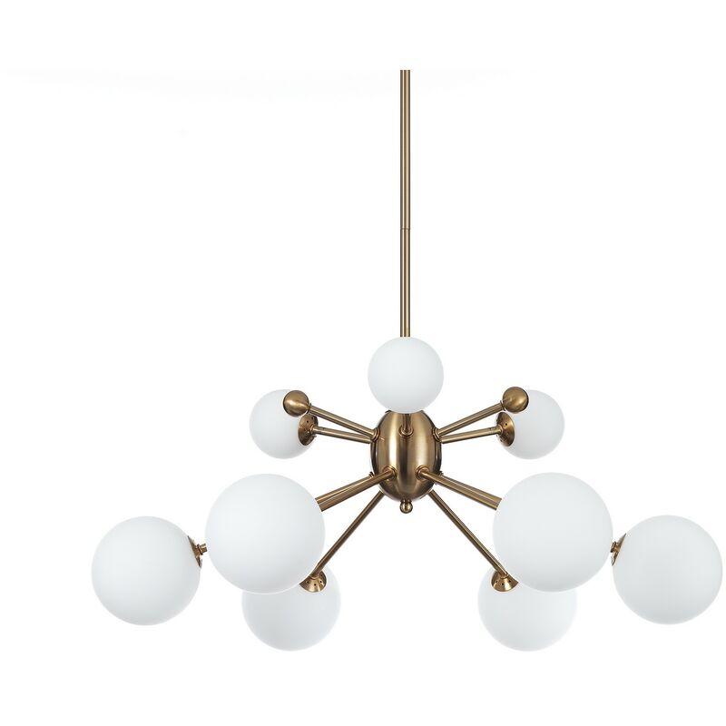 Lampadario DERWEN - realizzata in acciaio finitura Bronzo - dimensioni cm. Ø.68 H.87 - Nr.9 paralumi realizzati in vetro bianco opaco - Nr.6 paralumi Ø.12 cm - Nr.3 paralumi Ø.8 cm - predisposta per nr.9 lampadine G9 max 25W (non in dotazione) - Voltage 220V 50HZ