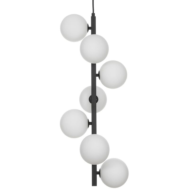 Lampadario BENTON - realizzato in acciaio verniciato Nero opaco - dimensioni cm. L.30 P.30 H.75 + cm.100 cavo regolabile - Nr.7 sfere realizzate in vetro bianco opaco - dimensione sfere Ø13 cm - predisposta per nr.7 lampadine G9 max 25W (non in dotazione) - Voltage 220V 50HZ