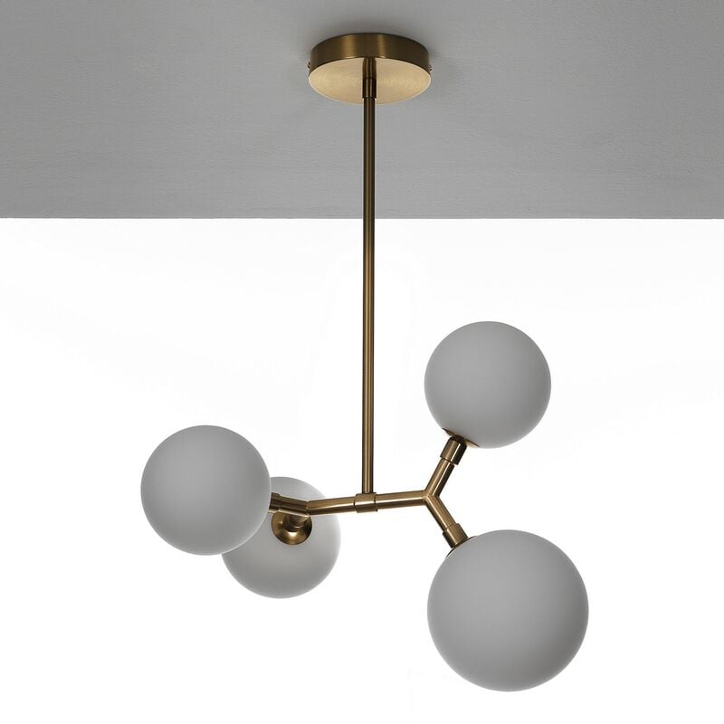 Lampadario LILY - realizzato in acciaio verniciato Ottone opaco - dimensioni cm. L.40 P.32 H.65 - Nr.4 sfere realizzate in vetro bianco opaco - Nr.3 sfere Ø13 cm - Nr.1 sfera Ø15 cm - predisposta per nr.4 lampadine G9 max 25W (non in dotazione) - Voltage 220V 50HZ