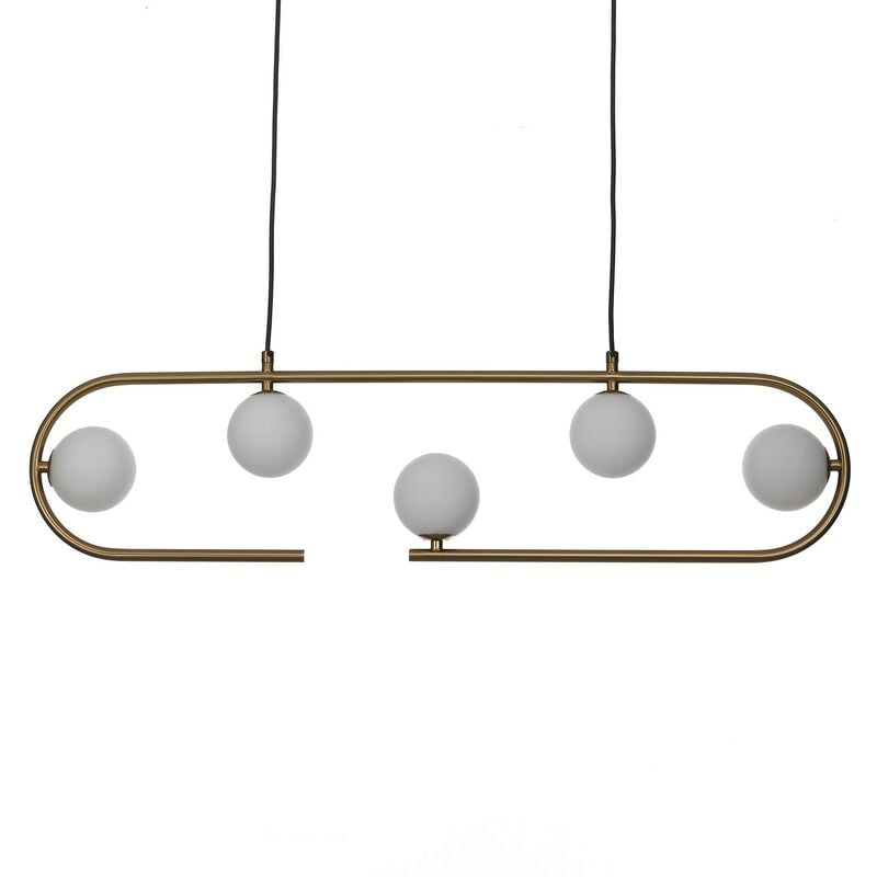 Lampadario MASON - realizzato in acciaio verniciato Ottone opaco - dimensioni cm. L.86 P.9,5 H.22 + cm.100 cavo regolabile - Nr.5 sfere realizzate in vetro bianco opaco - dimensione sfere Ø9,5 cm - predisposta per nr.5 lampadine G9 max 25W (non in dotazione) - Voltage 220V 50HZ