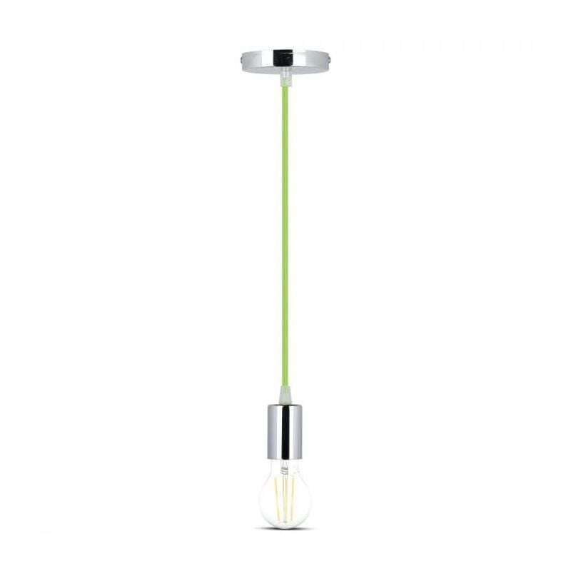 Lampadario portalampada pendente in metallo per lampade E27, con cavo ricoperto in tessuto annodabile di colore verde, cappellone cilindrico cromato 39mm, supporto in alluminio fornito di viti e piastra di fissaggio per linstallazione a soffitto.Compatibile con tutte le lampade LED o alogene con attacco E27 (lampada LED non inclusa). Prodotto di facile installazione grazie alla connessione a morsetti a vite.Adatto ad ogni stile. Ideale per larredamento in casa o per creare decorazioni allinterno di attivit commerciali come: Lounge Bar, showroom, hotel, negozi, ristoranti ecc Installabile solo in ambienti interni Waterproof IP20.Lampadina led non inclusa Serie pendente: VT-7388 Elegant Stylish serie “Light Holder-Chrome” Tensione: AC 220-240V, 50Hz Tipo di Attacco: E27 - (Max. 60W) Formato Lampade LED consigliate: A60/67, ST-64, G95/G120. Lunghezza Cavo: 1000mm - Cordone verde. Dimensioni: Ø39x 60(H)mm Materiale/Rifiniture: Metallo effetto cromato specchio.