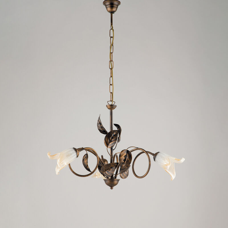 Collezione Limone L'ELEGANZA INTRAMONTABILE DEL FERRO BATTUTO Lampadario classico a 3 luci con struttura in ferro battuto forgiato a mano da mastri artigiani laccato color marrone e oro ducale. Il fusto è adornato da foglie anch'esse in metallo ed i bracci terminano con graziosi diffusori in vetro lavorato a mano a 3 punte sfumato ambra. E' possibile modificare l'altezza del lampadario grazie alla catena regolabile, rendendo questa sospensione adattabile a tutti gli spazi. Questa sospensione si ispira alle manifatture di una volta, con il suo colore ed i particolari curati in ogni dettaglio, si adatta perfettamente ad ambienti classici, country chic, tradizionali. Disponibile anche nella versione avorio e oro.