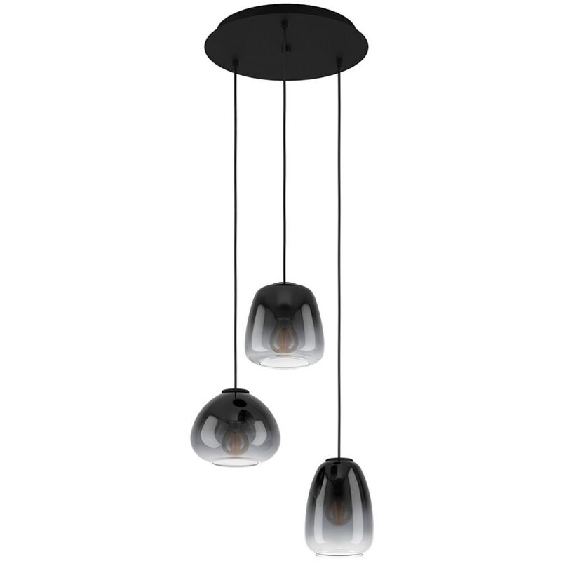 Collezione Aguilares UN TRIS DI PARALUMI PER UNA LUCE SPECIALE La lampada a sospensione AGUILARES è composta da tre diversi paralumi pendenti in vetro con delicate smussature.. La sfumatura di colore in nero trasparente e i cavi neri di stoffa ad altezze differenti dalla struttura ovale in metallo nero completano abilmente il look elegante della lampada. La lampada a sospensione si armonizza perfettamente con un arredamento dallo stile moderno e offre un'illuminazione particolare nel soggiorno o nella sala da pranzo, posizionata al di sopra del tavolo da pranzo. Le lampadine a filamento presenti nell'immagine non sono incluse nella consegna. Per la lampada è adatta qualsiasi lampadina con attacco E27.