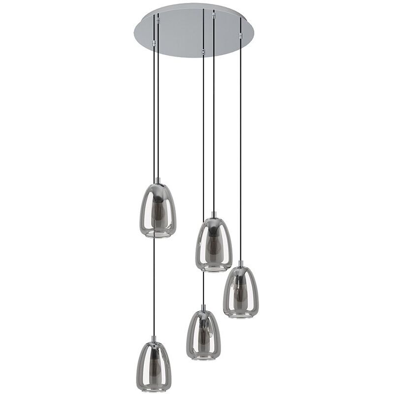 Collezione Alobrase LA TUA LAMPADA PER UN AMBIENTE MODERNO E DI TENDENZA La lampada a sospensione ALOBRASE è composta da cinque paralumi dalla forma organica in vetro fumé nero trasparente.. Pendono da una struttura rotonda in metallo color cromo tramite cavi neri. Grazie alla disposizione del pendolo a forma di elica sulla struttura, questa lampada di tendenza si armonizza in modo particolare in arredamenti moderni ed offre un'elegante illuminazione per ogni ambiente, che sia nel soggiorno o nella sala da pranzo, posizionata al di sopra del tavolo da pranzo. Le lampadine a filamento presenti nell'immagine non sono incluse nella consegna. Per la lampada è adatta qualsiasi lampadina con attacco E27.