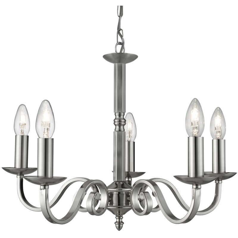 Collezione Richmond CANDELABRI DI CLASSE Questo pendente in argento satinato a 5 luci è perfetto per gli interni sobri di oggi. Caratterizzata da un design minimalista, questa lampada a sospensione è caratterizzata dalle sue tradizionali applique all'estremità degli otto bracci curvi con finitura argento satinato per un look semplicistico e meno complicato, con 5 lampade a candela. La sospensione a catena è regolabile in altezza, consentendo all'utente di adattare questa sospensione a 5 luci a qualsiasi altezza del soffitto o di garantire che la sospensione sia appesa in basso sopra un tavolo da pranzo per un'illuminazione suggestiva.