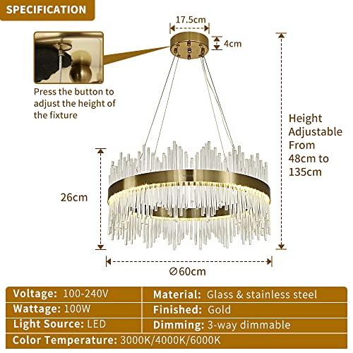 Lampadario al cristallo d'oro: luce pendolare moderna, luce rotonda a cristallo regolabile, lampadina di lusso, per salotto, sala da pranzo, camera da letto, ristorante, Ø60 cm
