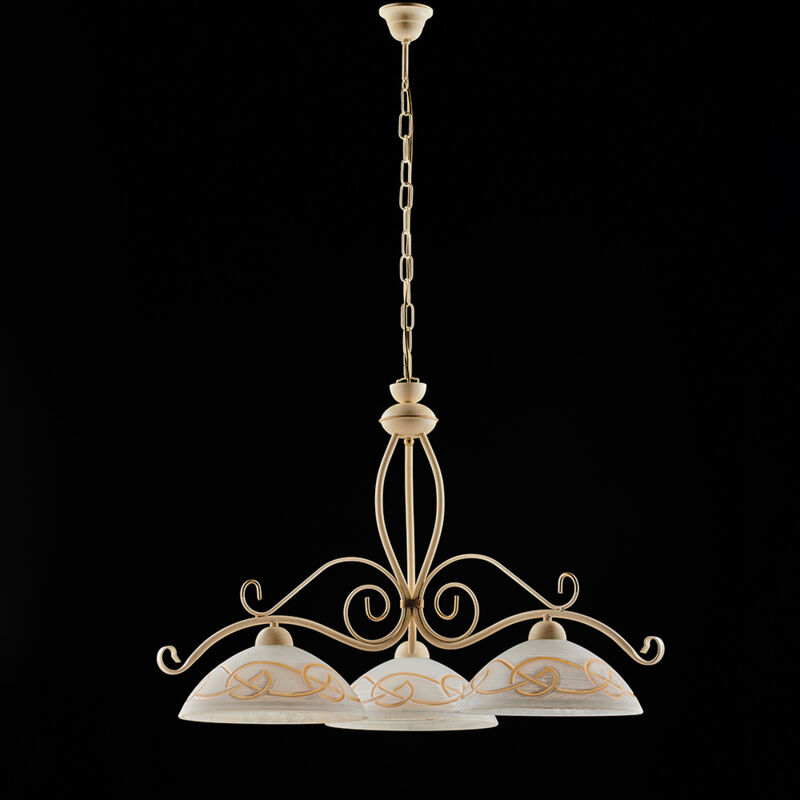 Collezione Faraone L'ARTE POVERA DI CLASSE Lampadario 3 luci realizzato artigianalmente in ferro battuto forgiato a mano, laccato con pittura termoindurente color avorio con decorazione decapé e rifiniture oro. Si completa con diffusori di vetro centrifugato diam.30 cm color sabbia e decori ambra. In base alle diverse esigenze è possibile modificare l'altezza del lampadario grazie alla catena regolabile, rendendo questa sospensione adattabile a tutti gli spazi. La linea Faraone risulta particolarmente adatta in ambienti rustici, con travi scure in legno e pavimento in cotto, perfetta per arredaredallo stile imponente, case di campagne, taverne, ristoranti ed ambienti rustici in generale. Disponibile anche nella versione nero e ruggine.