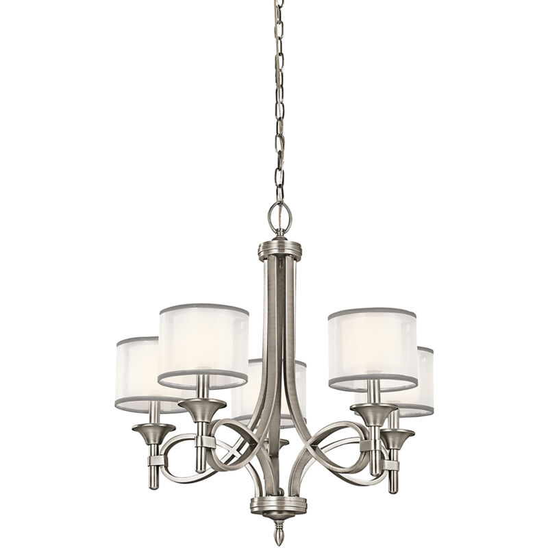 Collezione Lacey BELLISSIMO CONTRASTO Lampadario a 5 luci. La collezione Lacey offre un bellissimo contrasto, fondendo il fascino dello stile del Vecchio Mondo con materiali moderni e puliti, originariamente disponibili in bronzo antico. Ora abbiamo aggiunto la finitura peltro antico per esaltare lo stile deciso e lineare dei bracci arrotondati. Le lampade sono dotate di doppi paralumi all'avanguardia in tessuto di organza con vetro interno opalino.