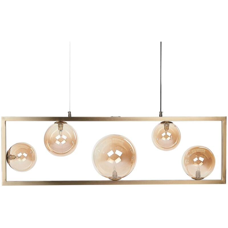 Lampadario decorativo glamour. Scopri il fascino di un'elegante lampadario, dove la raffinatezza incontra l'arte. La struttura in ottone metallico, squisitamente lucida e traforata, ospita elegantemente cinque delicati paralumi a globo in vetro. Lascia che questa sofisticata composizione aggiunga un tocco di eleganza all'arredamento della tua casa. Dettagli: Tipo di prodotto: Lampadario Stile: Moderno Colore principale: Ottone Tipo di materiale: Metallo Materiale principale: Ferro Materiale secondario: Vetro Materiale del paralume: Vetro Potenza elettrica: 9W Finitura: E-Coating (pittura elettroforetica) Codice IP di protezione: IP 20 Lampadine richieste: 5 Voltaggio: 220-240 V (50 Hz) Dimensioni: Lunghezza del cavo: 85 cm Profondità: 20 cm Larghezza: 100 cm Altezza: 133 cm Peso: 4 kg L'offerta include: 1 x Lampadario, Non include: Lampadine Caratteristiche chiave: Ideale come luce ambiente, Look accattivante, Si adatta a ogni stile d'interno, Colori trendy ed eleganti, Alta qualità