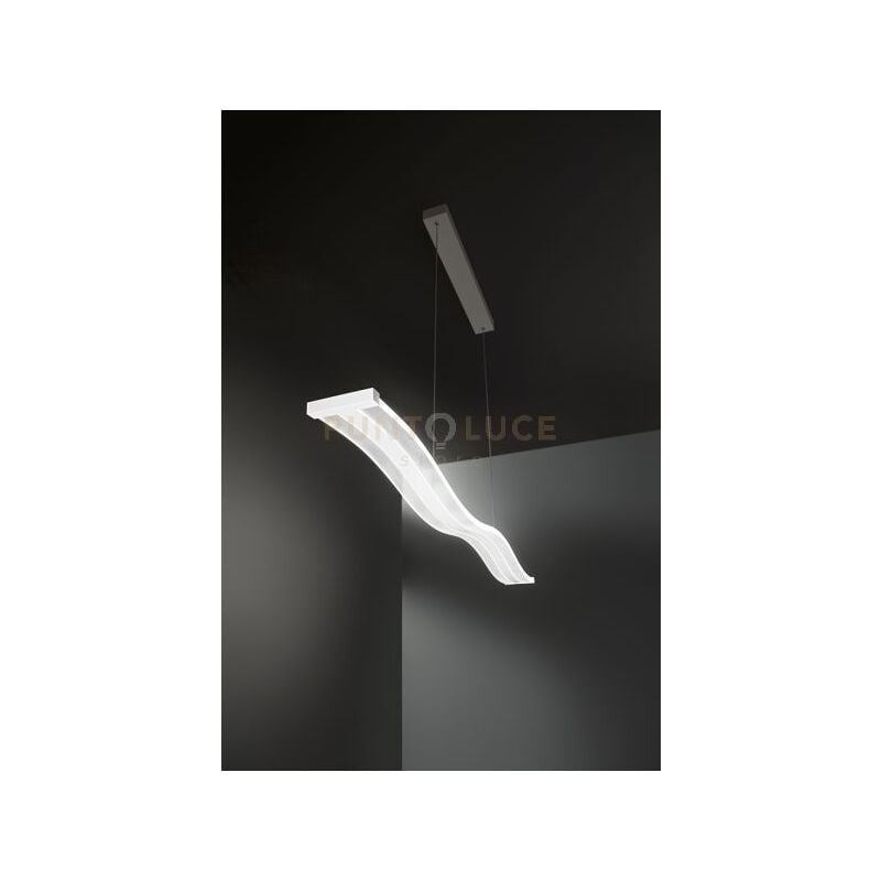 Sospensione in metallo e alluminio verniciato a polveri bianco opaco con diffusori ondulati in acrilico trasparente con microincisioni a laser.