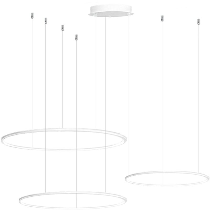 ERIKA S3D è una lampada a sospensione con tre cerchi luminosi a Led integrato, in alluminio bianco e silicone, ideale per illuminare cucina, soggiorno o open space dal design moderno. Tre anelli luminosi che fluttuano a soffitto con diametro diverso, d. 60, d 80 e d 100 centimetri. Illuminazione di grande effetto e risparmio energetico. Lampadario moderno Gea Led ERIKA S3D LED Sospensione, alluminio bianco, modulo led integrato, 3000°K Struttura in alluminio satinato bianco. Diffusori in silicone bianco opale. Categoria Lampade a sospensione. Diametro diffusori 60 cm, 80 cm, e 100 cm, completa di decentramenti per posizione le altezze dei diffusori in orizzontali o obliqui . Altezza regolabile dalla base con sistema autobloccante "grip lock". Lunghezza regolabile cavi elettrici massima 200 cm. ERIKA S3D è composta da tre anelli luminosi circolari con altezze regolabili, i cavi possono essere fissati al soffitto in modo decentrato. Categoria Lampade a sospensione. ERIKA S3D è una
