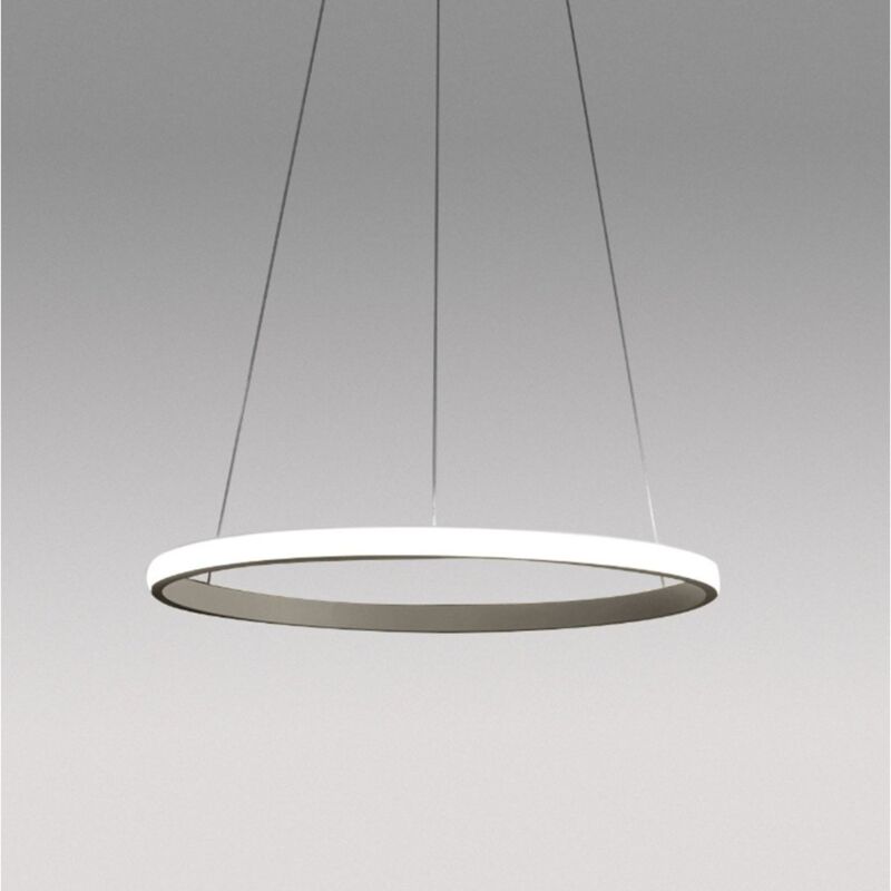 Lampadario moderno dalla forma originale e morbida che volteggia con leggerezza nella stanza. Una sospensione che si differenzia dalle altre per il posizionamento della striscia led nella parte esterna del diffusore, questo permette un illuminazione maggiore e più diffusa in tutto l'ambiente. Lampadario moderno Gea Luce IOLE S1 28W LED Sospensione moderna, alluminio titanio, LED, 3000°K Apparecchio a sospensione. Struttura in alluminio verniciato TITANIO. Schermo diffondente in silicone bianco opale. Modulo led integrato da 28W max (dipende dalla dimmerazione) con tonalità della luce calda (3000°K). Il lampadario composto da 1 anello misura 60 cm. Altezza regolabile dalla base. Base tonda, ancoraggio soffitto, di 16 cm per un'altezza di 4.5 cm e copribase di 19 cm. Dimmerabile tramite dimmer esterno + push (non inclusi) ma a richiesta. Lunghezza cavi elettrici massima 110 cm. Regolabile in altezza con sistema autobloccante ""grip lock". Tipo Led CRI >80 Driver elettronico integrato