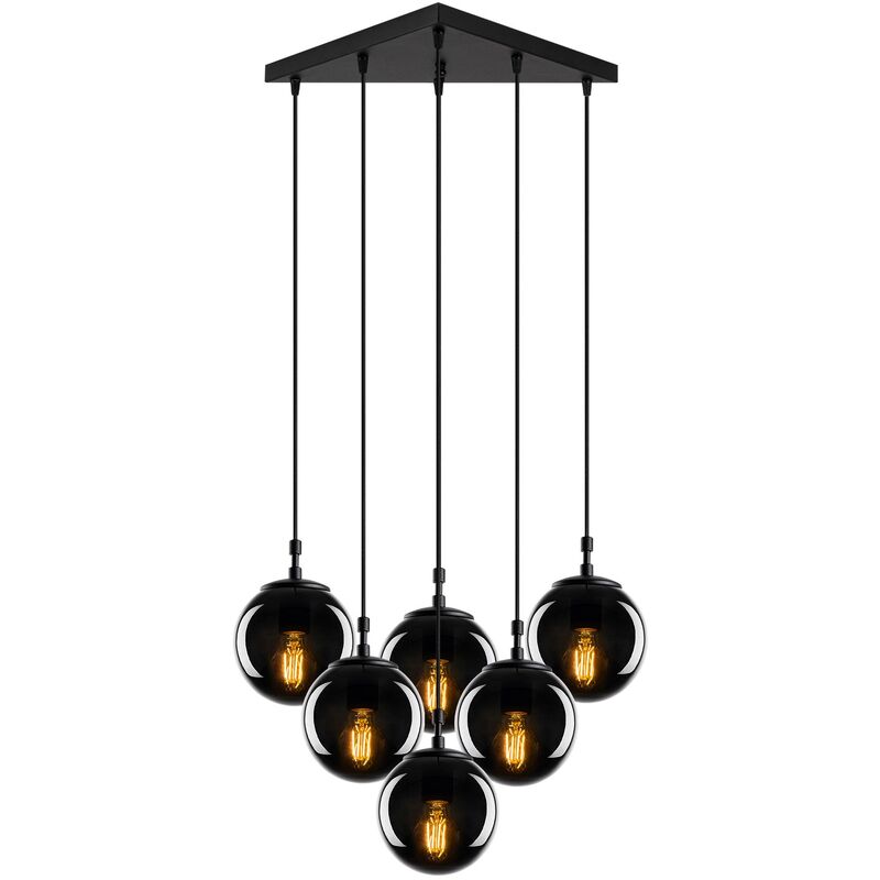 Lampada da soffitto Struttura in metallo Paralume in vetro Dimensioni: 55 x 50 cm Altezza: 110 cm Diametro paralume: 15 cm Altezza paralume: 15 cm Altezza regolabile Dimensioni della base: 48 x 48 x 3 cm Lunghezza cavo: 90 cm Tipo di filettatura: 6 x E 27 Max 40 W IP20 Colore: nero Fumé