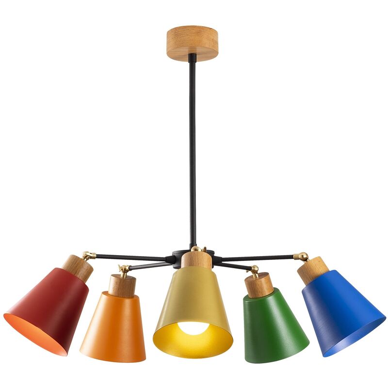 Lampada da soffitto Struttura in metallo Base in legno Diametro: 58 cm Altezza: 68 cm Diametro paralume: 14 cm Altezza paralume: 13 cm Diametro della base: 10 cm Altezza base: 4 cm Tipo di filettatura: 5 x E 27 Max 40 W IP20 Colore: arcobaleno