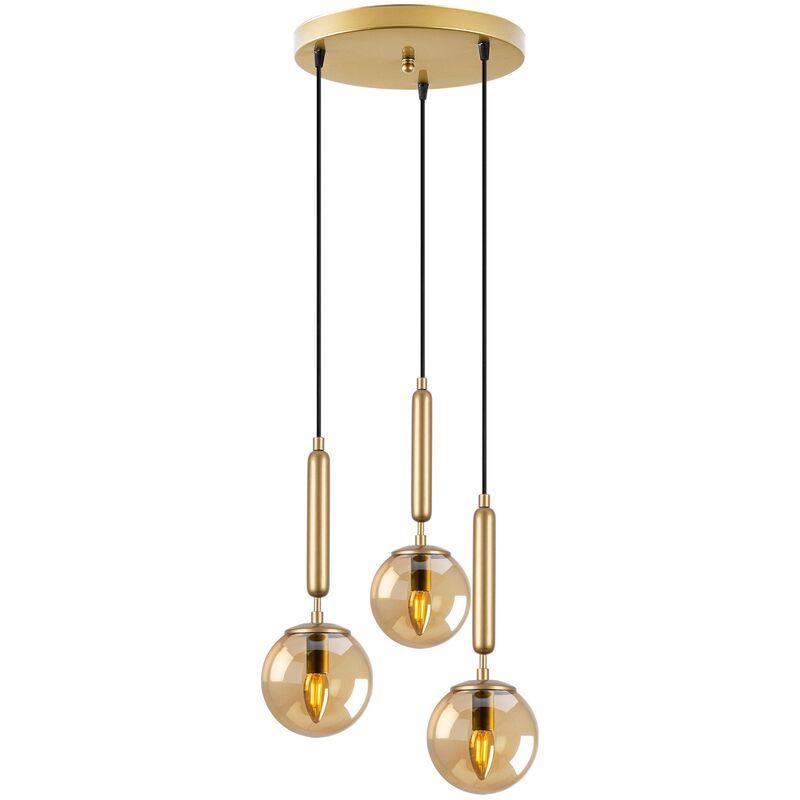 Lampada da soffitto Struttura in metallo Paralume in vetro Diametro paralume: 15 cm Altezza paralume: 15 cm Misure: 34 x 34 x 134 cm Diametro della base: 30 cm Altezza della base: 3 cm Lunghezza del cavo: 90 cm IP20 Tipo di filettatura: 3 x E14 Max 40 W Altezza regolabile Colore: oro brillante