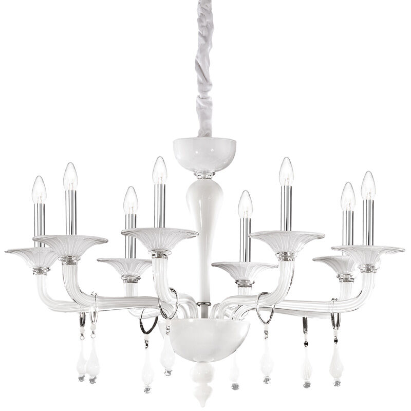 Collezione Miramare DIVINO Lampadario a 8 luci in vetro trasparente e bianco soffiato e lavorato a mano. Copri portalampade e dettagli in metallo cromato. Copricatena in velluto.