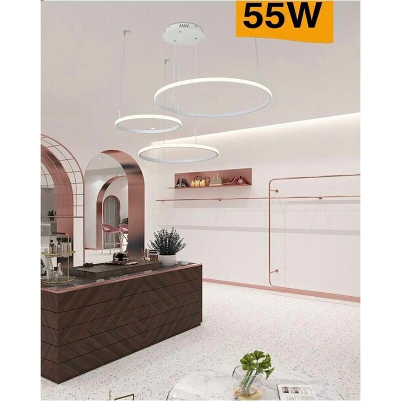 Lampadario a sospensione formato da 3 anelli a led di diverse dimensioni con la possibilità di cambiare la disposizione degli anelli secondo le proprie esigenze che creano un tocco di elegante modernità. Specifiche: Potenza: 55 watt Flusso luminoso: 4400Lm CRI: RA>80 Angolo del fascio luminoso: 180 Gradi Kelvin: Luce naturale 4000k Alimentazione: AC 220V-240V/50 HZ-60HZ Struttura realizzata in metallo e acrilico di colore bianco Dimensioni diametro degli anelli: Ø600x25mm Ø450x25mm Ø350x25mm Misure base a soffitto: 260 mm Peso: 2.5kg Il contenuto della confezione: N 1 Lampadario