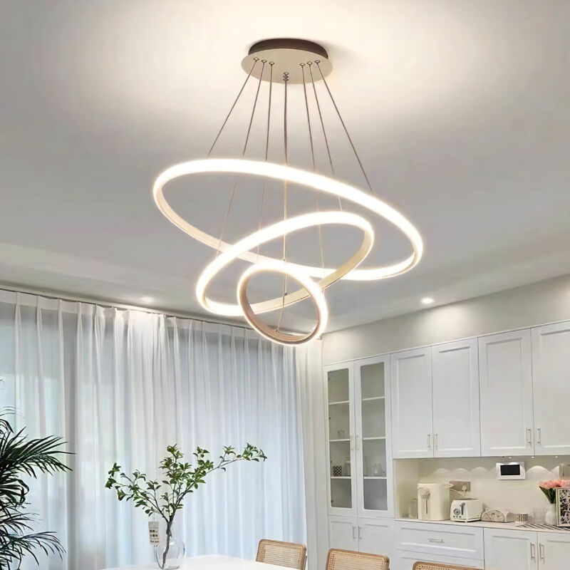 Lampadario a sospensione 3 cerchi 60W bianco liscio design moderno LAMP106 Lampadario a sospensione composto da tre cerchi concentrici, si presenta con uno stile di design moderno e contemporaneo. I tre cerchi sono composti da una potentissima luce LED ad alta efficienza energetica, permettono quindi, una grande luminosità all'ambiente in cui lo si va ad installare. La lunghezza dei cavi in acciaio, è regolabile, questo permette di creare composizioni tra i tre cerchi, in modo variabile. Esempio: a piramide, a piramide inversa (cono), oppure inclinati tra di loro formando intersezioni, è possibile metterli anche sullo stesso piano in modo concentrico. Caratteristiche tecniche: Potenza 60 W Tensione di funzionamento 220-240v AC (non occorre trasformatore) Frequenza 50 - 60 HZ Tecnologia LED SMD 2835 Intensità luminosa 5400 lumens Resa 600w (rispetto a un'alogena) Temperatura luce Scegliere la tonalità tra quelle disponibile Indice di Resa Cromatica CRI 80 UGR