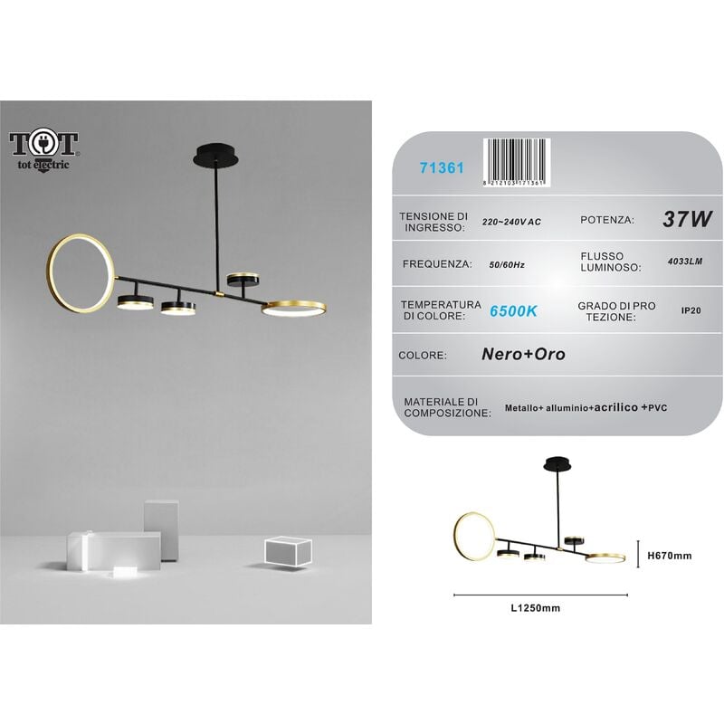 Lampadario sospeso con illuminazione led dal design moderno e minimal. Struttura composta da 5 cerchi, distribuiti in modo orizzontale. Ideale per spazi di casa, negozi, uffici e locali dedicati al ristoro. Caratteristiche tecniche Potenza 37W Flusso luminoso 4033lm Colore corpo Nero e oro Voltaggio AC220-240V Frequenza 50/60Hz Dimmerabile No Uso Interno Luce disponibile 6500k bianca - 4000k naturale Materiale Metallo + Alluminio + Acrilico + PVC Dimensioni Larghezza 1250 mm Altezza 670 mm Tipologia: A sospensione