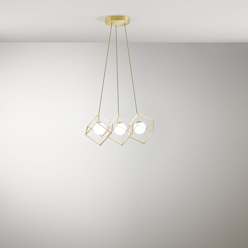 Collezione Cube FORME LUMINOSE SOSPESE Sospensione in metallo Oro opaco e diffusore sferico in vetro bianco 3xG9 max 28W (non incluse). D.45 x H.200 cm Altezza regolabile. IP20 A++. Sospensioni con struttura in metallo verniciato a polvere. Diffusore sferico in vetro bianco.