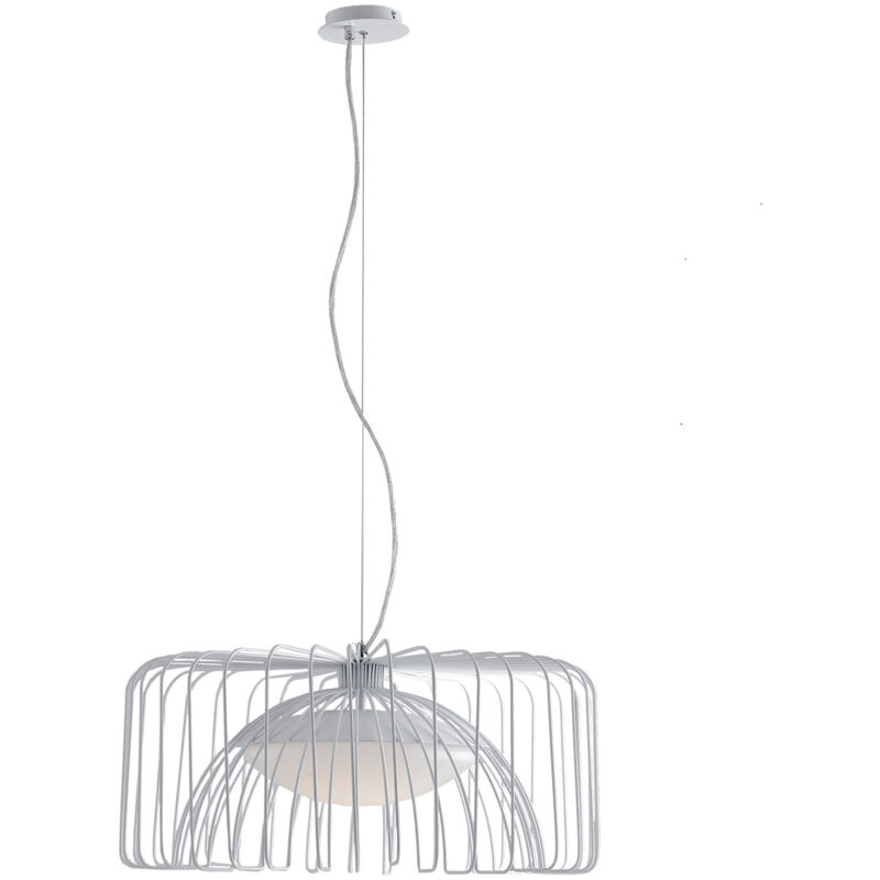 Sospensione in fili di metallo disponibile nei colori nero e bianco matto con diffusore opale al centro. Colore: Bianco Materiale: Metallo Tipo sorgente o lampadina richiesta: LED Watt: 24W Lumen: 2740 Lumen Kelvin: 4000K Grado di protezione da corpi solidi e acqua: IP20 (solo uso interno) Altre informazioni: ;