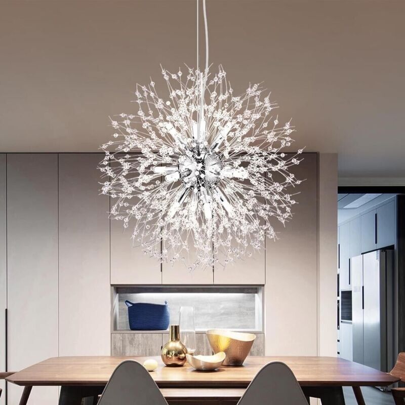 Lampadario dal design moderno costituito con fili impreziositi da piccole perline di cristalli trasparenti in acrilico color argento. Dotato di 9 portalampada con attacco G9 (lampadine non incluse). Caratteristiche: Tensione: AC 100-240v -50/60Hz Attacco g9 (lampadine non incluse) Materiale: Alluminio + Cristalli Diametro: 50 cm Lunghezza filo: 115 cm (regolabile) Peso: 2.5 Kg Colore: Argento Contenuto della confezione: N 1 Lampadario