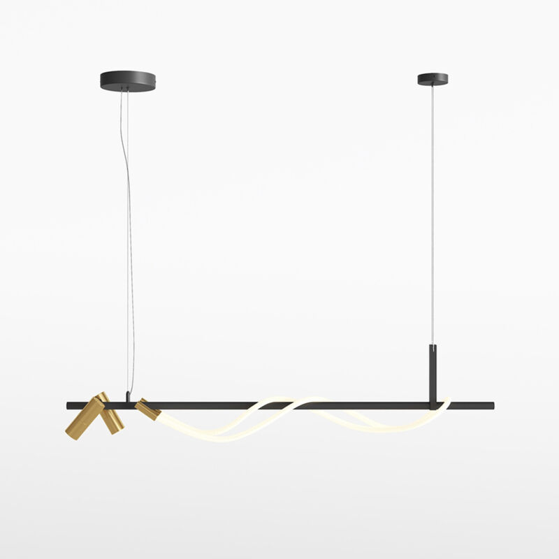 Collezione Tau DISTRIBUISCI LA LUCE NEL TUO AMBIENTE Lampadario a Sospensione Moderno Tau luce Led 30W armatura in Alluminio Nero Oro 3000 K IP20 L.18 x W.180 x H.150 cm. Corpo in alluminio. Sfumature: oro, combinazione di oro e nero. Diffusore di due tipi: tubo in silicone e laccio super resistente super resistente (non ingiallisce nel tempo, ha un'elevata resistenza). Luce morbida e uniforme grazie all'alta densità dei LED. Temperatura di colore 3000K. Sorgente luminosa a LED.