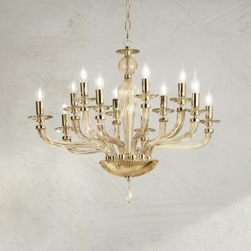 Lampadario VILLA realizzato in vetro lavorato a mano con particolari in metallo. Un elemento dalle linee raffinate, ideale per illuminare e al tempo stesso arredare con particolare eleganza salotti e soggiorni contemporanei. Lampada a sospensione VILLA in vetro lavorato a mano. CARATTERISTICHE Colore: Ambra Materiale: Vetro, metallo Tipologia: Lampada a sospesione Modello: 12 luci Altezza max: 140 cm Larghezza: 85 cm Profondita': 85 cm Dimmerabile: NO Illuminazione: 12 x E14 (L'attacco E14 permette di installare lampadine a LED, fluorescenti o alogene non incluse). Input: 220-230V
