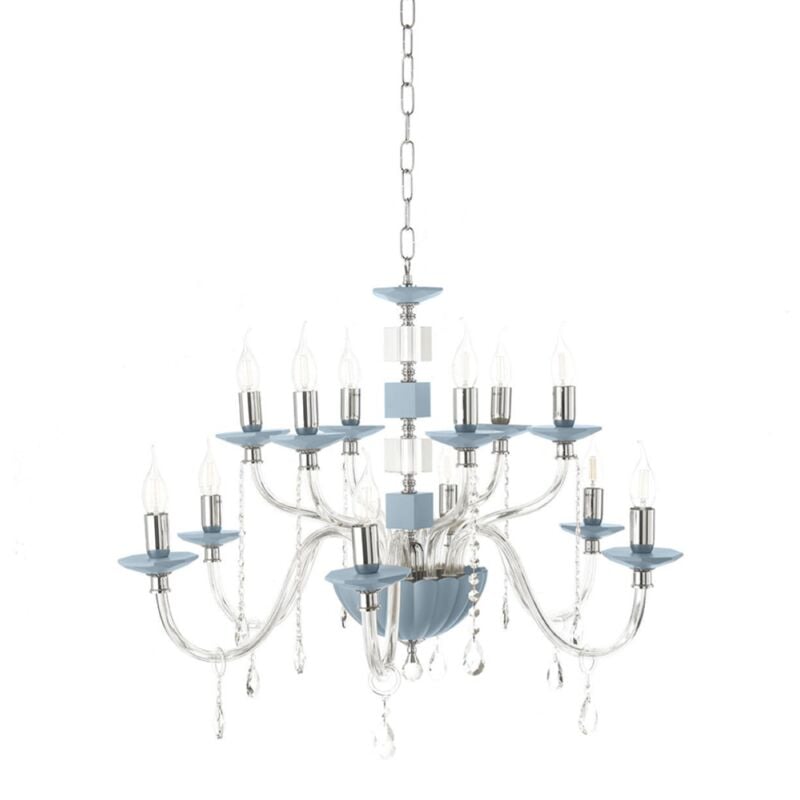 Lampadario a sospensione LIVIA composto da piccoli cubi bianchi e trasparenti molto particolari che si distanziano delle linee morbide dei bracci. Questo lampadario e' perfetto per illuminare grandi ambienti come il soggiorno o il salotto. Il prodotto e' imballato con estrema cura, non viene spedito gia' montato, ed occorre effettuare il montaggio e assemblaggio dei pezzi in vetro direttamente in loco. Questo lampadario essendo realizzato artigianalmente puo' presentare delle imperfezioni dovute alla lavorazione come piccole bollicine d'aria o micro graffi. CARATTERISTICHE Colore: Ottanio Materiale: Vetro, metallo Tipologia: Lampada a sospensione Modello: 12 luci Altezza max: 130 cm Diametro: 85 cm Dimmerabile: NO Illuminazione: 12 x E14 (L'attacco E14 permette di installare lampadine a LED, fluorescenti o alogene non incluse). Input: 220-230V
