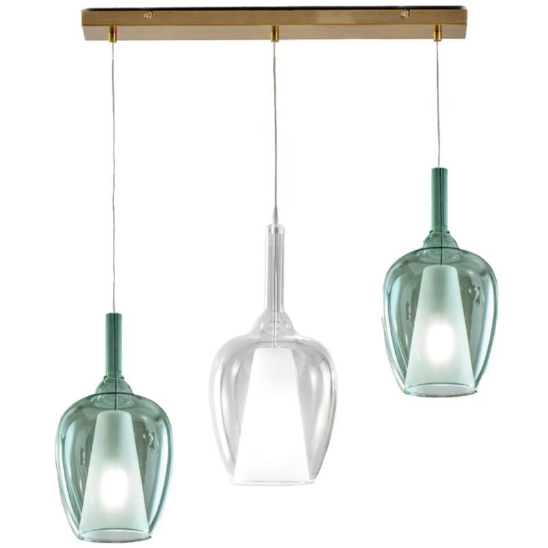 Sospensione da un primo impatto moderna ma rifinita da una struttura metallica classica. Vetri lisci di colore verde trasparente e trasparente, che a seconda della tonalità di luce può trovare un prefetto connubio fra classico e moderno. Una lampada da soffitto a tre luci da regolare in altezza secondo le proprie esigenze. Una sospensione adatta per illuminare piani d'appoggio come tavoli da pranzo, penisole o scrivanie oppure da posizionare al centro della stanza per creare un piacevole movimento. Una facile installazione per un tocco di colore e un singolare effetto scenico. Lampadario vetro colorato Gea Luce OFELIA S10 Lampada soffitto, vetro verde e trasparente, attacco E27 LED I vetri misurano un diametro di 20cm, un diametro della bocca inferiore di 12cm e un altezza del vetro di 40.2cm. Altezza cavo elettrico 300 cm, regolabile. Filo elettrico trasparente. Finitura base OTTONE . Base al soffitto rettangolare lunga 66cm per un altezza di 2.5 e una larghezza di 9.5cm. Finitura