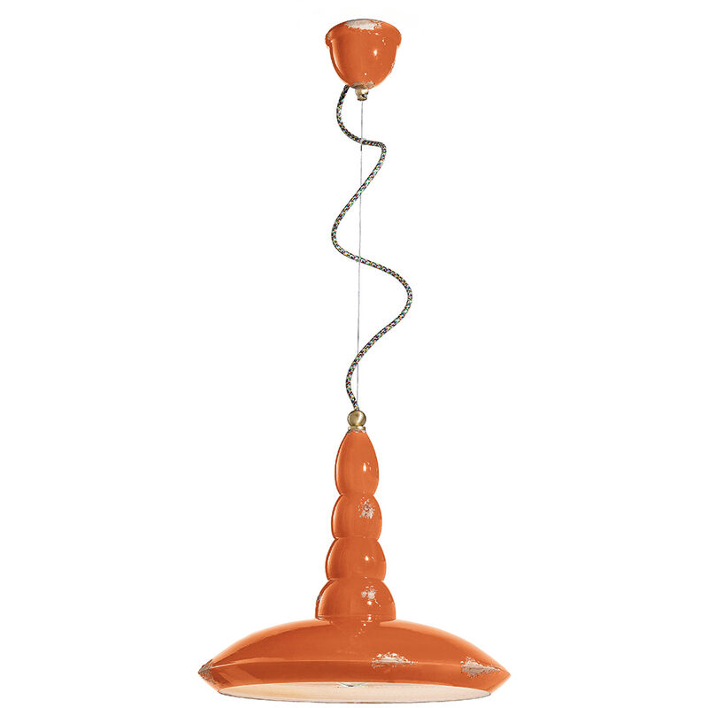 Collezione Vague-Vintage FORME GEOMETRICHE ADDOLCITE DA RAFFINATE SFUMATURE Sospensione 1 Luce diam.40 cm h.37 cm in ceramica con finitura vintage arancio lavorata a mano da artigiani specializzati.. Una sospensione geometrica dall'aspetto moderno accuratamente resa invecchiata dalle mani di esperti artigiani. Una finitura volutamente invecchiata che assieme alla linea della lampada è capace di dare carattere sia ad interni minimal che ad arredi ricercati. Ideale per illuminare penisole in cucina o tavoli da soggiorno dove occorre una luce diretta. Questo articolo è realizzato interamente a mano ed è disponibile anche in altre finiture, come da foto campione. Per richiedere una composizione diversa è possibile indicarlo nell'apposito campo NOTE presente in conclusione di ordine indicando il codice della finitura oppure contattarci dopo aver effettuato l'ordine. Essendo un prodotto 100% artigianale, stai acquistando un prodotto unico e per tanto può differire leggermente dalla foto.