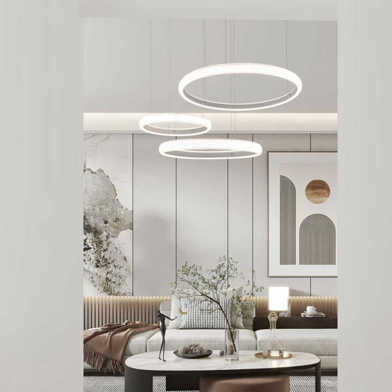 Lampadario sospeso a led dal design moderno e innovativo. Formato da 3 anelli di diverse dimensioni che vengono fissati al soffitto con dei fili in modo asimmetrico, creando un tocco di originale modernità e decorare allo stesso tempo ambienti interni. Potenza: 60 watt Flusso luminoso: 4800 Lm Angolo luminoso: 180° Temperatura della Luce: 3000K Tensione di ingresso: AC 220-240V 50/60Hz Colore: Bianco Materiale: Alluminio - Acrilico Diametro Anelli: 630 - 490 - 380 mm circa Altezza regolabile: 1200 mm Diametro base: 200 mm Peso: 3.2 Kg