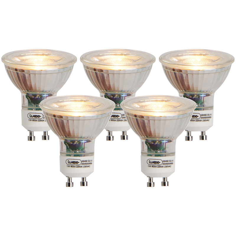LUEDD Set di 5 lampade LED GU10 filamento fiamma 1W 80 lm 2200K Cerchi una lampadina GU10 con bassa intensità luminosa e luce calda? Allora questo set di 5 lampadine è quello che fa per te! Ogni lampadina ha 80 lumen e 2200 Kelvin, il che rende la luce molto bassa con una luce molto calda. Sembra quasi la luce di una candela! Ecco perché la lampadina è descritta come Fiamma. La lampadina è alta 5,5 cm e ha un diametro di 5 cm. Attenzione: questa lampadina non può essere smorzata. Rendi la tua casa super suggestiva con questa lampadina GU10. Funzioni extra: Non regolabile Lampadine inclusiva Il LUEDD Set di 5 lampade LED GU10 filamento fiamma 1W 80 lm 2200K è Trasparente. Gli spazi abitativi adatti per questa lampada sono: . Termina l'aspetto dei tuoi interni con questo Set di 5 lampade LED GU10 filamento fiamma 1W 80 lm 2200K! QAZQA è un marchio che rende l'unicità accessibile. Sappiamo che l'interior design è reso speciale da singoli oggetti di design che completano elegantemente