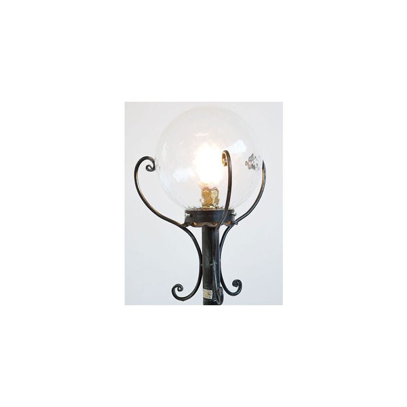 LAMPADE LINEA TAVERN LAMPIONE LANTERNA DA APPLICARE SU PALO Agli amanti dei sapori rustici, Cruccolini propone un'intera gamma di lampade in grado di ricreare le atmosfere mistiche ed accoglienti dei casolari di campagna. La fragilità del vetro e la forza del ferro si uniscono nelle lampade “Tavern”, dando vita ad oggetti dal design unico ed originale. Guizzi di luce si diffondono dal paralume in vetro soffiato Balloton, che consentono un'illuminazione diffusa per un'atmosfera romantica e delicata. Ogni dettaglio di queste lampade è stato selezionato, forgiato ed assemblato con cura, per ottenere un risultato impeccabile sia nell'estetica che nella funzionalità. La passione italiana per le cose belle e di qualità, trova soddisfazione in queste opere artigianali di alto livello. Abbinabile con gli altri complementi della collezione. E27 1x100 watt - sfera diametro cm. 25 - altezza cm. 45 - colore Nero Argento Paralume: Vetro soffiato Balloton