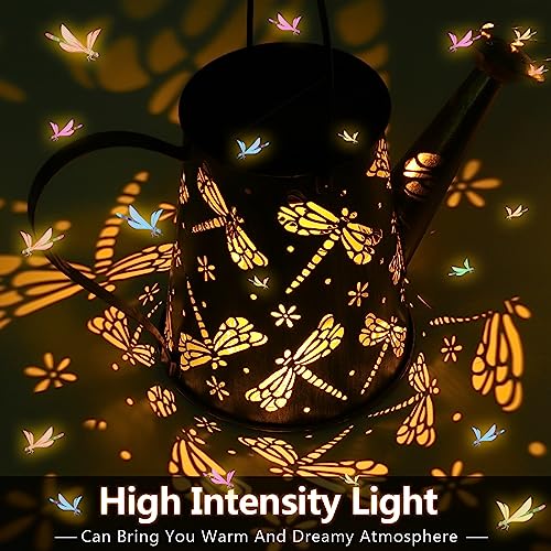 ✨【Splendido Design】Lanterna solare all'aperto con motivo di libellule e stringa di luce fata, stringa di luce è composta da 6 fili di rame. L'annaffiatoio 2 in 1 con luci e lanterna solare appesa è dotato di un gancio per pecore, puoi anche appenderlo all'albero per illuminare il tuo sentiero e gli alberi.