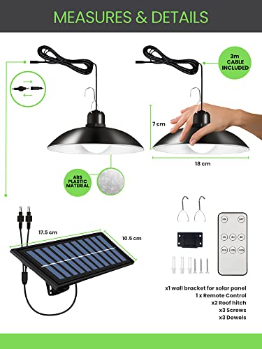 SET 2 LAMPADE A SOSPENSIONE: Set progettato con 2 lampade a sospensione nere + 1 pannello solare con design separato per una migliore collocazione. Le luci e il pannello sono interconnessi con un cavo lungo 3 metri (incluso) e sono ideali per illuminare contemporaneamente interni ed esterni come una stanza, un patio, un terrazzo, un portale, un giardino.