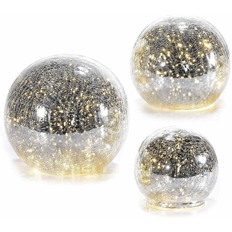 Eleganti lampade da tavolo per decorare la casa dalla forma sferica realizzate in metallo martellato ed alimentate a batteria. Un vero e proprio complementi d'arredo per la casa, dal colore argento e con luci Led dalla tonalit bianco caldo. Da usare come centrotavola o su mobili e scrivanie. Grazie all'alimentazione a batteria (pile stilo non incluse) potrai posizionarle ovunque senza bisogno di attacco alla presa elettrica. Fornite in set da 3 lampade sono complete di timer della durata di 6 ore. Ciascuna lampada misura: Grande diametro 15 x altezza 14 centimetri Media diametro 12 x altezza 11,5 centimetri Piccola diametro 10 x altezza 9 centimetri