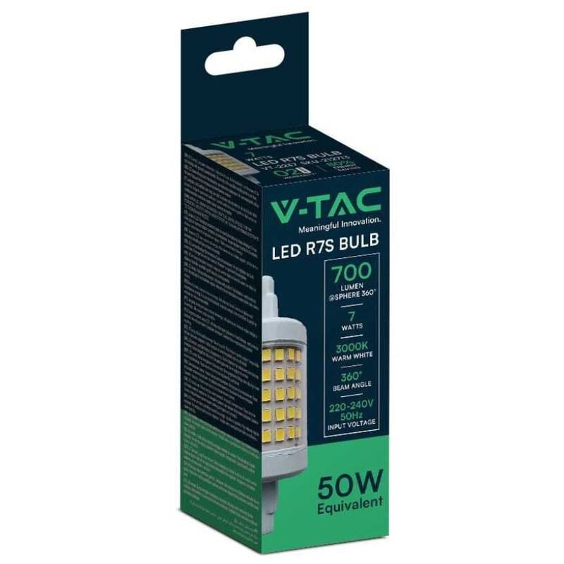 V-TAC Lampada led R7S potenza 7W, fascio luminoso 360, flusso luminoso ad alta luminosit 700LM (100LM/W) e colore luce bianco naturale 4000K. Forma tubolare in materiale termoplastico e ceramica con copertura trasparente V-TAC VT-2237 - SKU 212714 Rende possibile l'utilizzo della tecnologia LED negli apparecchi con attacco R7s (per le tradizionali Alogene lineari doppio attacco). Tipo di attacco: R7S Tipo di LED: SMD Alimentazione: AC 220-240V, 50Hz Potenza: 7W Colore della luce: Bianco naturale (4000K) Potenza (equivalente ad incandescenza): ~50W Materiale / Copertura Lampada: ceramica e termoplastica di colore bianco con copertura LED trasparente. Flusso luminoso: Alta luminosità 700LM - 100 LM/W Apertura fascio luminoso: 360° Dimensioni: Φ 28 x 78mm Vita media: 20.000h 2 Anni di garanzia. Classe energetica: F Dimmerabilità: NO PF >0.5 CRI >80