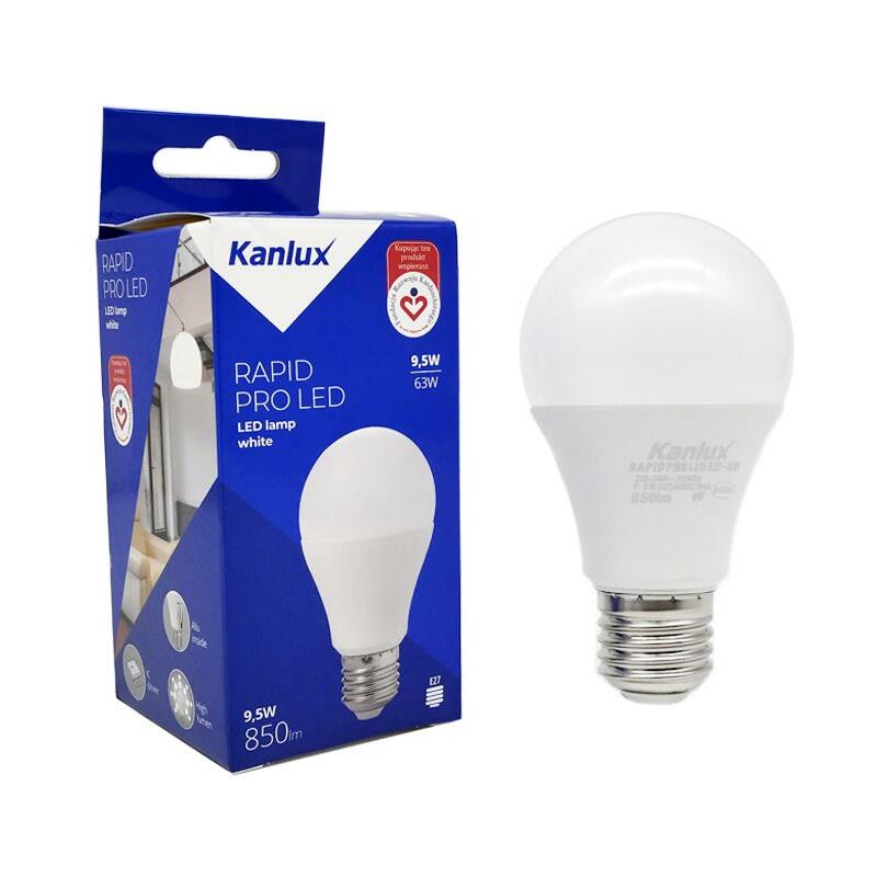 Le sorgenti Kanlux RAPID E27 sono controparti a LED delle lampadine a incandescenza tradizionali. Le loro versioni RAPID HI raggiungono la massima potenza (equivalenti a 100 W). Si distinguono principalmente per un alto flusso luminoso e un ampio angolo di visione. Un ulteriore vantaggio di queste fonti è il design dellalloggiamento ibrido.CARATTERISTICHE:.Colore: bianco.Temperatura di colore: 4000.Materiale: plastica.Materiale diffusore: Plastica.Sorgenti luminose EEI: A +.Tensione nominale: 220-240 CA.Potenza nominale: 9,5.Flusso luminoso utile nominale: 850.Durata nominale della lampada: 20000.Altezza: 109.Diametro: 60.Peso: 58 g
