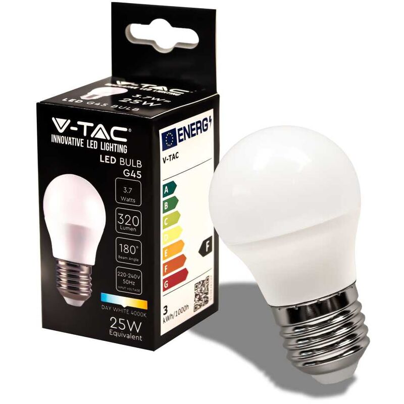 Lampadina a LED E27 in materiale termoplastico 3.7w luce bianco naturale 4000K Mod. 214162 Caratteristiche Tipo di attacco: E27 Alimentazione: 100-240V Potenza: 3.7W Potenza (equivalente ad incandescenza): ~35W Colore della luce: Bianco naturale(4000K) Flusso luminoso: 320Lm Apertura fascio luminoso: 180° Indice di resa cromatica (IRC): >80 Vita media: 25000h Dimmerabilità: NO Dimensioni: 45x80mm Classe energetica: F