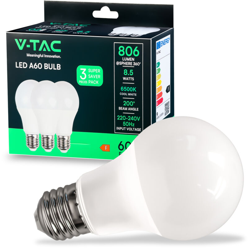 V-TAC Lampadine Lampadina LED E27 8,5W A60 6500K (Box 3 pezzi)