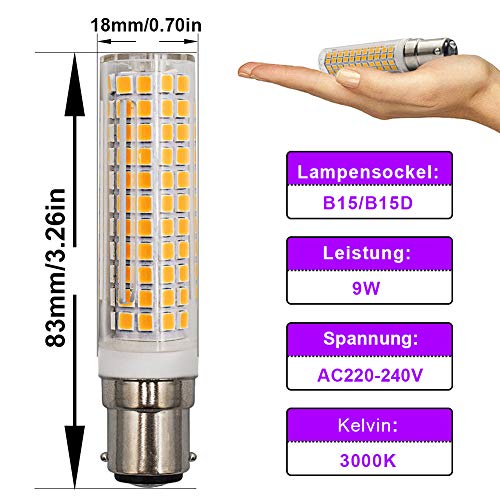 Lampadina a LED B15D, 9 W, equivalente 75 W, alogena, 3000 K, luce bianca calda, per macchine da cucire, ventilatore AC 220-240 V, confezione da 2