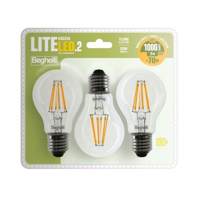 Lampadina filamento led2 goccia e27 7w 2700k pz.3 lumen: 1000 watt: 7 attacco: e27 luce: calda temp. colore k: 2700 dim. Øxl: 60x105 vita (h): 15000 classe energetica:d le lampade lite led filament beghelli hanno una buona efficienza e dimensioni adatte a tutti i tipi di installazione a vista. la confezione in blister multiplo è la soluzione economica per avere sempre una scorta di lampadine di ricambio. ideali per tutte le installazioni a vista. angolo fascio 360° - ra >80 avvertenza: lampadina led non dimmerabile, non utilizzare con variatori di luce.