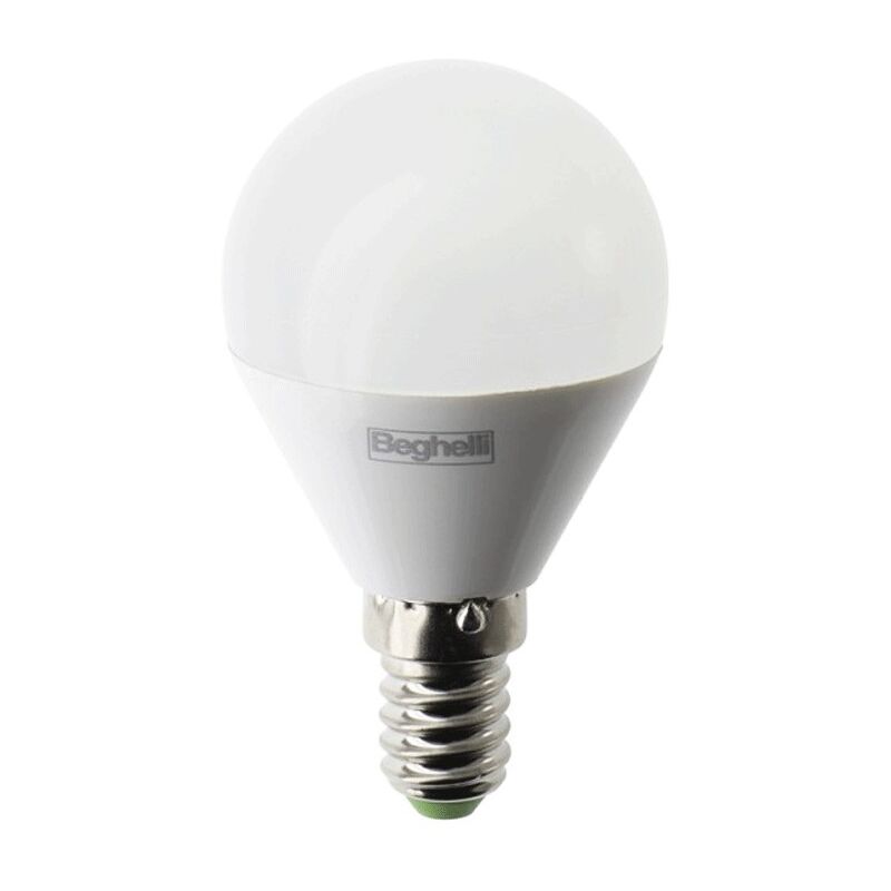 Lampadina a sfera LED Beghelli, con le seguenti caratteristiche: Attacco E14 Potenza 5W Luce calda 3000K Classe energetica F Le lampade a sfera Saving LED Beghelli hanno una buona efficienza e con flussi fino 450 lumen sono la soluzione economica per ogni installazione standard. Caratteristiche: Lumen 450 Led RA >80 Dimensioni: altezza 80 mm - diametro 45 mm Durata vita 20000 h Angolo fascio 160 gradi Classe energetica F Tipologia: LED Attacco: E14 Colorazione: Calda Forma: Sfera Classe Energetica: F Dimmerabile: No Temperature di Colore: 3000 Kelvin