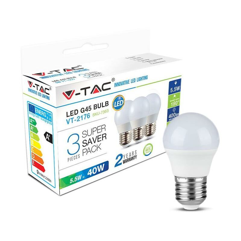 LED Lampadina 5.5W E27 G45 Bianco 3PZ/PACK SKU: 7364: VT: VT-2176 Caratteristiche del prodotto 80% di consumo energetico in meno rispetto alle lampadine standard Lunga durata Nessuna emissione di radiazioni UV e radiazioni non ionizzanti Accensione immediata, nessun tempo di riscaldamento Bassa potenza termica Direttamente sostituibile alle lampade ad incandescenza tradizionali Installazione Aree Commerciali e Residenziali Hotel, Bar Stand espositivi Lampadari Allaperto, esclusivamente allinterno di apparecchi idonei. Specifiche tecniche Informazione generale Attacco E27 Tipo Lampadina G45 Tipo LED SMD Vitamedia 30000 ore Dati elettrici Potenza 5.5W Potenza EQV. a incandescenza 40W Tensione AC: 220-240V Frequenza 50Hz Fattore di potenza 50Hz Dati tecnici luce Fascio Luminoso° 180° Colore della luce Bianco Temperatura di colore 6400K Flusso luminoso (lm) 470 lm Indice di resa cromatica Ra >80 Dettagli corpo Materiale Plastica Funzionalità Tempo innesco 100% 0.001 secondo Stabilità del