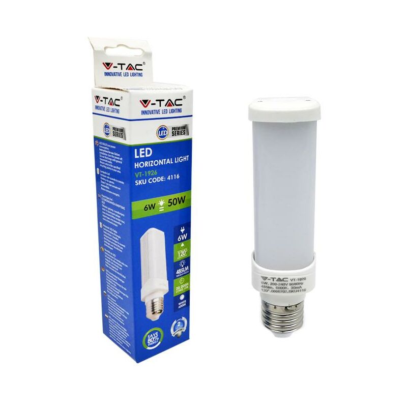 Lampadina LED 6W E27 PL Bianco SKU: 4116: VT: VT-1926 Caratteristiche del prodotto 80% di consumo energetico in meno rispetto alle lampadine standard Lunga durata Nessuna emissione di radiazioni UV e radiazioni non ionizzanti Accensione immediata, nessun tempo di riscaldamento Bassa potenza termica Direttamente sostituibile alle lampade ad incandescenza tradizionali Installazione Aree Commerciali e Residenziali Hotel, Bar Stand espositivi Lampadari Allaperto, esclusivamente allinterno di apparecchi idonei. Specifiche tecniche Informazione generale Attacco E27 Tipo Lampadina PL Tipo LED SMD Vita media >20 000h Dati elettrici Potenza 6W Potenza EQV. a incandescenza 60W Tensione AC: 200-240V Frequenza 50Hz Fattore di potenza >0.6 Dati tecnici Luce Colore della luce Bianco Temperatura di colore 6000K Flusso luminoso 485 lm Indice di resa cromatica Ra >80 Fascio Luminoso 120 ° Dettagli corpo Materiale Plastica Colore Bianco Funzionalità Dimmerabile No IP Protezione IP20 Tempo innesco 100%